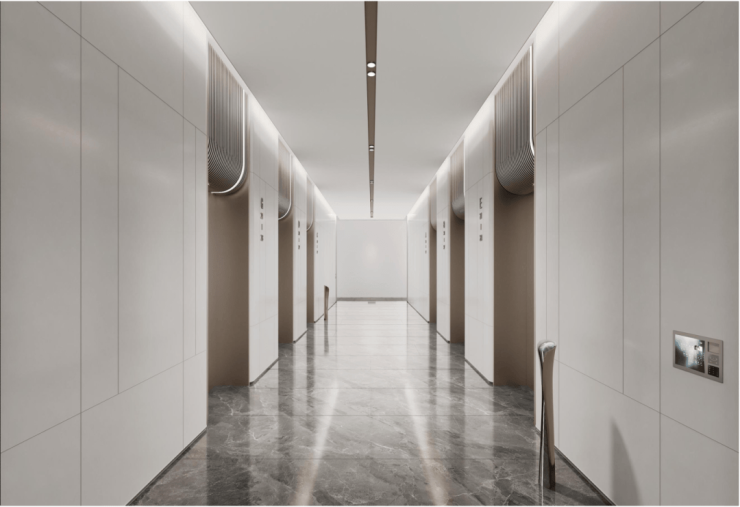 效果图展示低区大堂、中高区大堂及电梯厅设计。