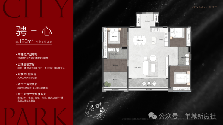 项目推出120-140㎡南向滨江四房,以空间美学与功能创新重新定义江景豪宅: