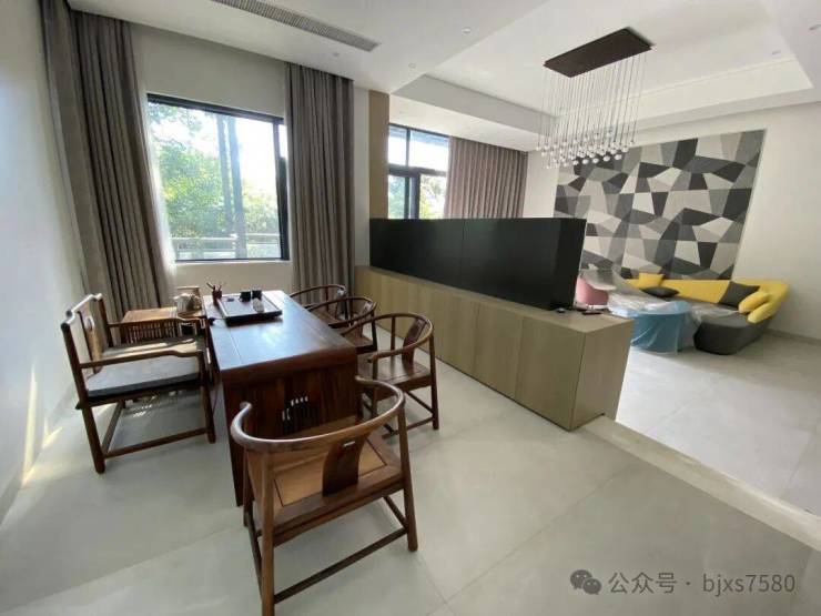 一层格局是,南向的客厅,直出是大阳台,望出去是无遮挡的视野,私密性也很好。客厅的东边设计茶室,功能独立。