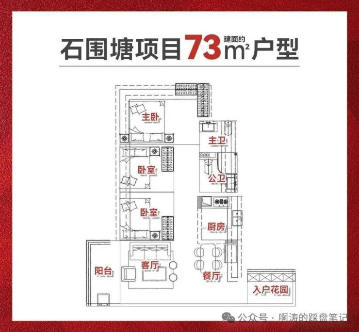 约73㎡三房,两个户型相似,主卧可以实现270°观景,还有衣帽间和独立卫生间。不过,独卫面积较紧凑,难做干湿分离。