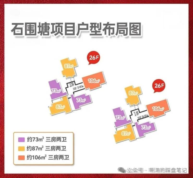 1、2栋户型分布一致,主打建面约73-87-106㎡三四房,总计250户。
