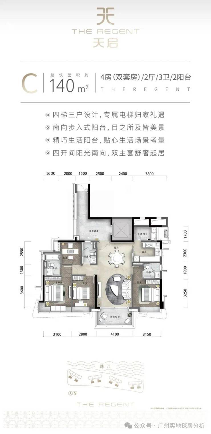 3、产品力与设计 在售产品: 珑岸叠墅(0.99容积率):280-437㎡,私家电梯入户,最高345%使用率,部分户型享360°U型阳台。 天启大平层:140-480㎡环幕江景现房,270°无遮挡视野,专梯专户,国际一线品牌交标(如劳芬卫浴、大金空调)。设计团队:美国AEcom园林、梁志天室内设计、弧形玻璃幕墙造价高昂。