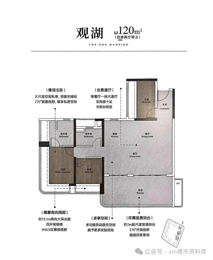 户型3:建面约120㎡户型可视为98㎡的升级放大版,保留了7米宽大阳台,南向采光面总长13.1米,进一步强化了空间尺度与功能完整性。