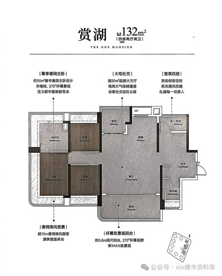 户型4:建面约132㎡户型延续横厅+南北对流布局,可拓展为4+1房,功能灵活,适合多孩家庭或需要独立办公间的置业者。
