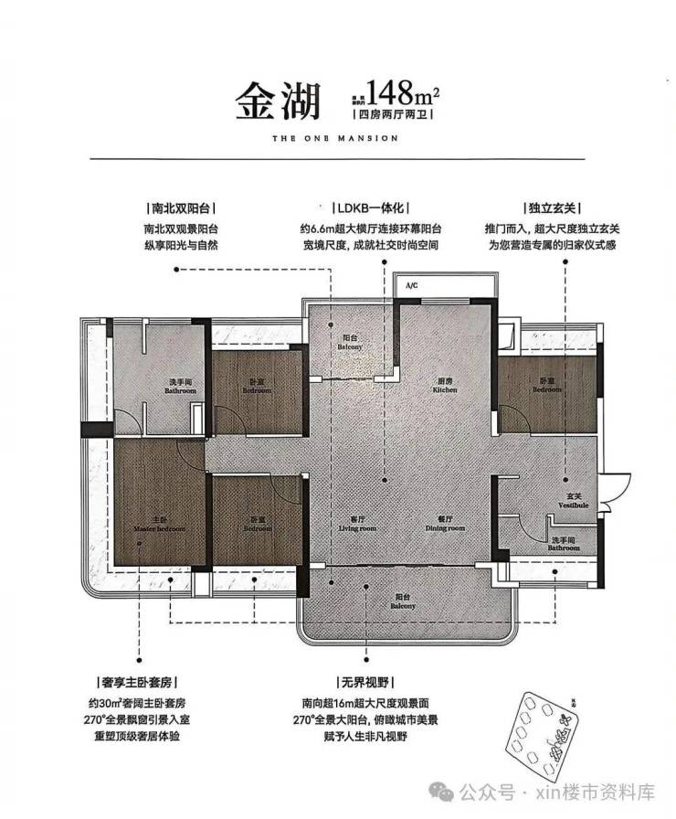 户型5:建面约148㎡户型主打改善奢适尺度,主卧面积约30㎡,整体南向面宽达16米,在板块内同面积段产品中颇具竞争力。