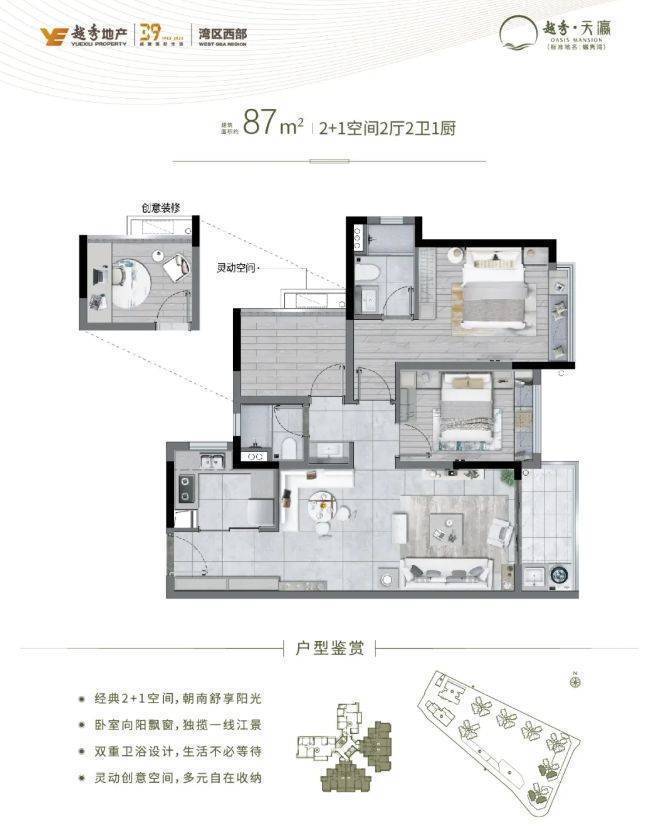 户型设计精巧实用,主推 87㎡/104㎡/125㎡三四房,得房率高达 94 - 98%,空间利用充分。建面约 87㎡的 2 + 1 创意空间 2 卫户型,南向三开间,能直揽江园美景,使用率约 94%。104㎡的 3 + 1 创意空间 2 卫户型,南向 4.5 米开间,约 96% 使用率,约 6 米超宽横厅,可尽揽江园景观面。125㎡的 3 + 1 创意空间 2 卫户型更是亮点十足,南向 4.5 开间,15.3 米阔绰采光面,约 98% 使用率,近 8 米对流进深,约 6.7 米巨幕景观面,近 5 米景观阳台头排亲珠江,可收藏江园美景,南北对流,进深约 7 米的主卧套房搭配 L 型瞰景飘窗,居住舒适度极高。