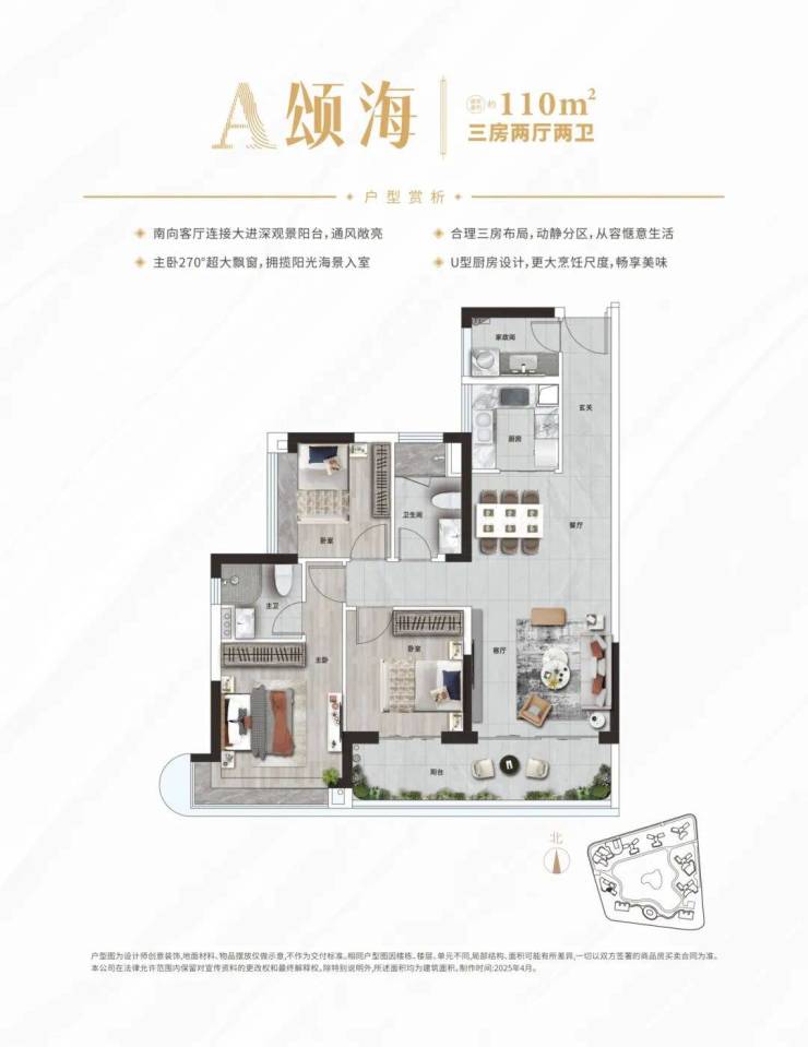 建面约110㎡三房:南向双卧室+多功能书房,U型厨房+独立家政间,小户型亦显从容。