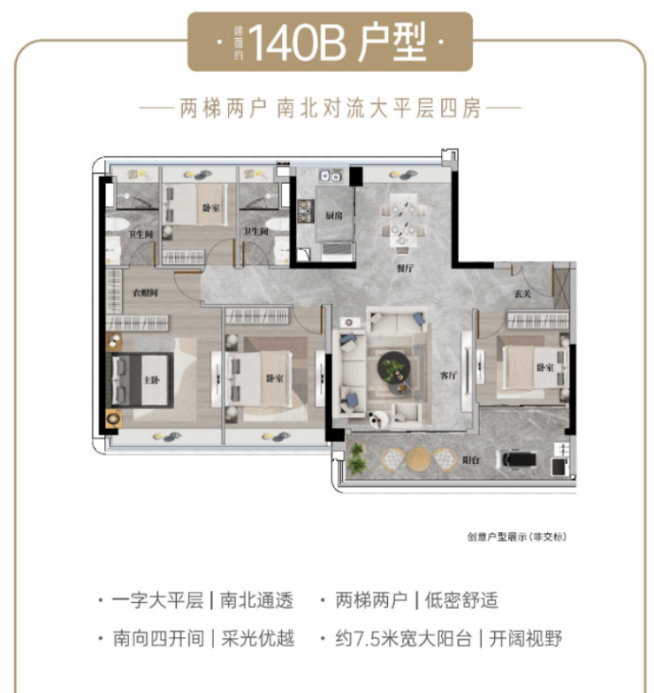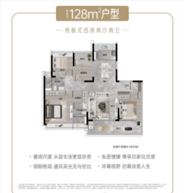 建面约140-143㎡的四室两厅两卫是2梯2户设计,专梯入户私密性特别好