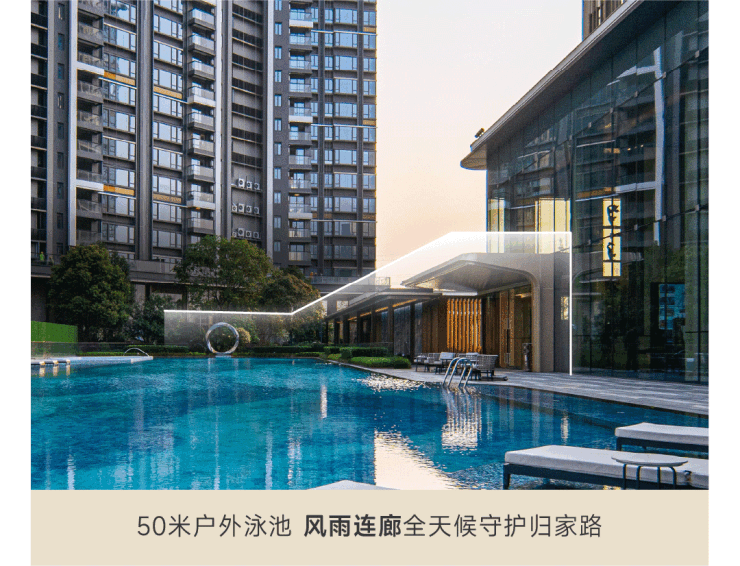 走进小区,风雨连廊连接起每一栋楼的大堂,加宽的顶棚设计,大太阳或雨天都能慢悠悠走回去,不用狼狈地躲雨。此刻的D1栋,雨后园林的空气里散发着泥土与青草的芬芳,会所泳池的水面映着蓝天白云,写意生活已然完整呈现。