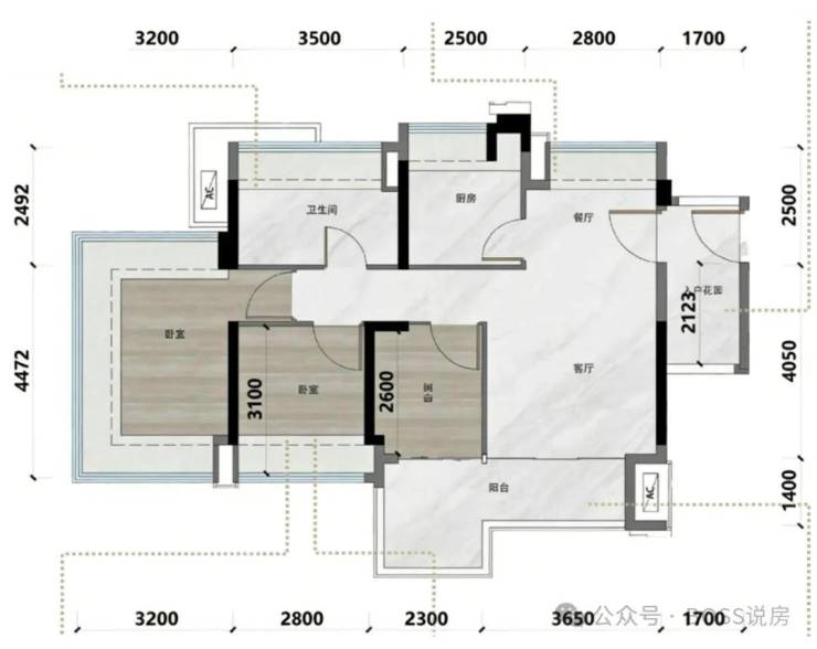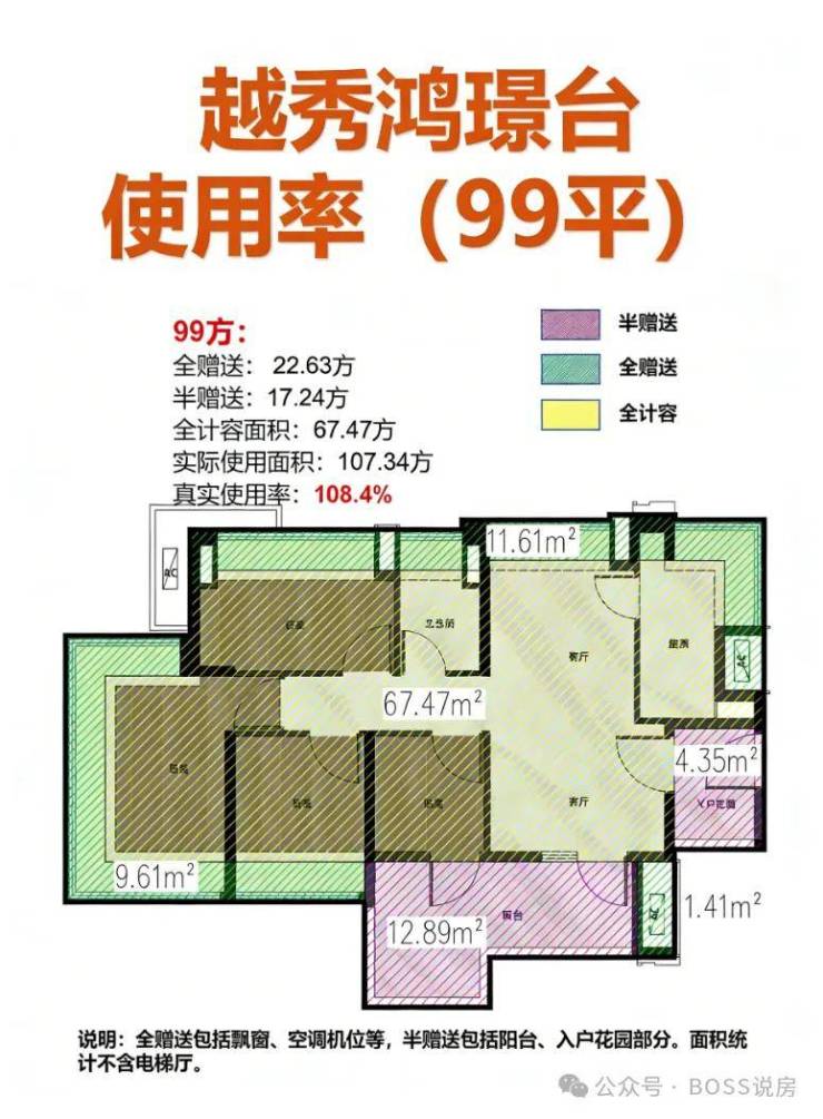 产品亮点:新规高使用率(据称超 100%),全屋飘窗,搭配入户花园与大面积阳台,空间通透。