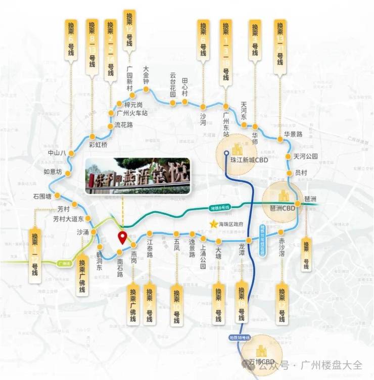 1、交通:保利燕语堂悦门口便是广佛线+11号线(已开通)燕岗站。通过广佛线转3号线,7站到珠城,不到三根烟时间。对琶洲、珠城上班的朋友,很友好。海珠最成熟的商业,基本都在这里了。