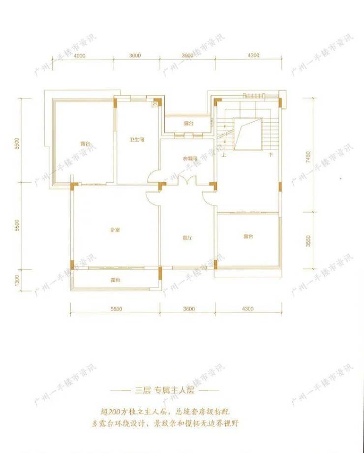 别墅三层则是专属的主人空间,三层整层使用面积超200㎡,整层仅做了一个主人套房,还拥有4个超大露台可一览小区园林湖景。