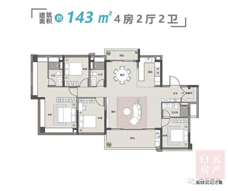 先来看最大的建面约143平4房,四开间朝南,南北双阳台对流。