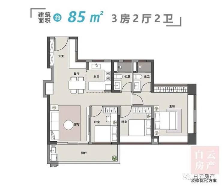 上车款的建面约85平3房户型也很精致。