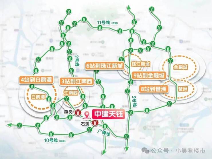 从项目出发,乘坐11号线外环去琶洲只需要8个站,耗时44分钟左右;去珠江新城坐广佛线到沥滘换乘3号线,全程仅6个站,耗时35分钟左右。