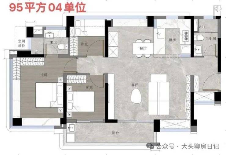 108㎡3+1房位于1、2栋朝向和景观相对较好的梯腿,属于95㎡的进阶。