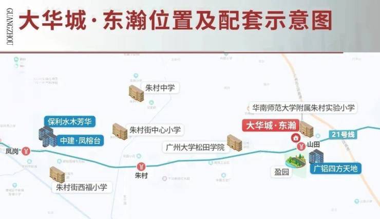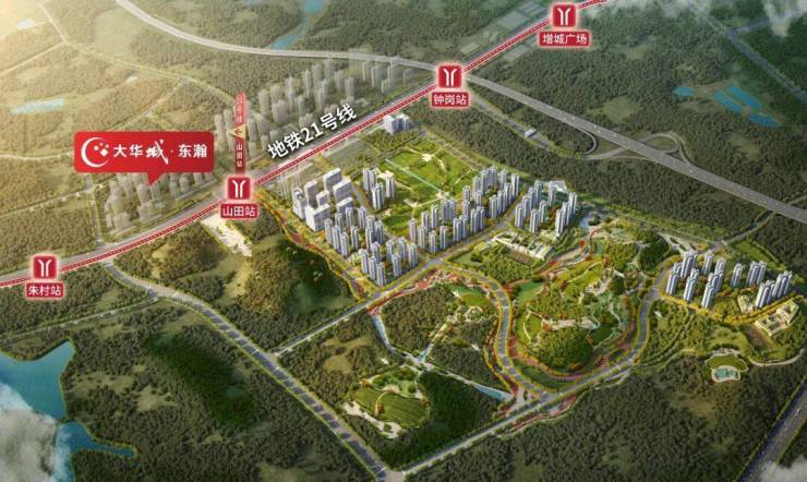大华城——涵盖大华朱村中心城市地标(规划中)、地铁、教育、产业、商业、生态各项配套,名副其实的一生大城,未来容纳广州东约 30 万人口繁华居住地。