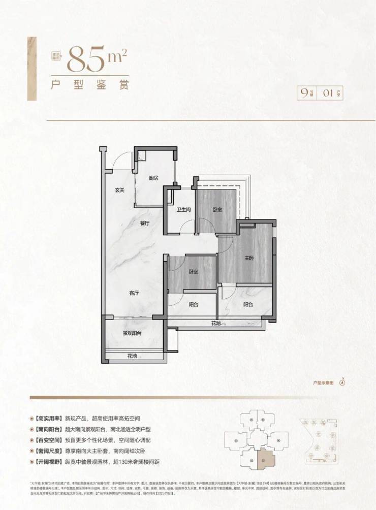 85㎡3房2卫(纯南向望花园):130米楼间距,采光视野绝了!抵得上旧规100平,还没小房间憋屈;