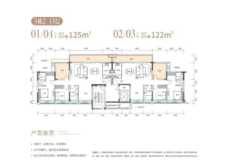 楼栋采用板式结构,两梯四户,室内通风采光俱佳。空间布局合理,充分发挥尺度优势,提高户型面积使用率与功能性。