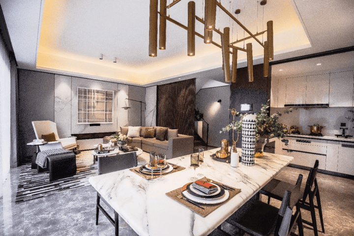 一层是近70㎡的私家花园,及会客厅及1间南向卧房,二层是餐客厅厨房及1间卧室,三层是休息区共有3间卧室。