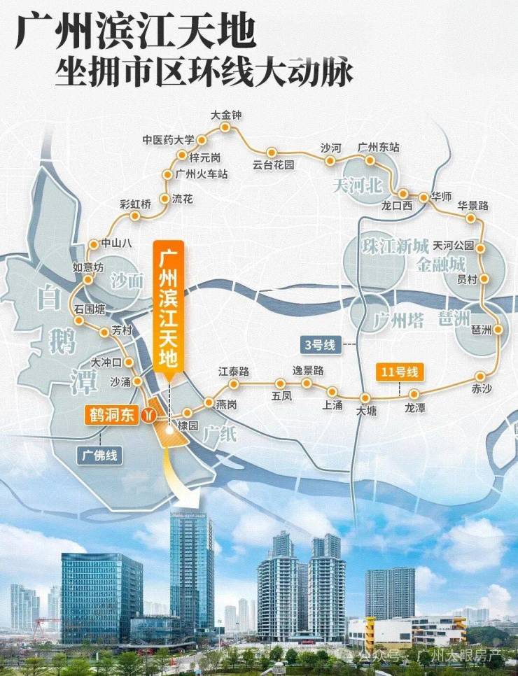 广州11号线鹤洞东站地铁上盖,拥有3横2纵大路网+公交站场+水上巴士,集水、陆、轨等多维交通方式于一体,半小时城央生活圈,1小时湾区生活圈。