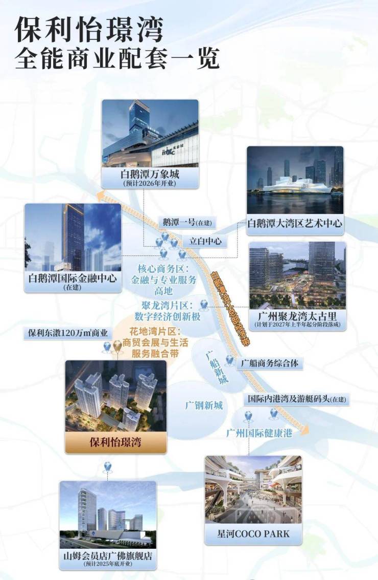 项目自身规划约40万㎡四大滨水商业街区,约700米处万科规划有18万㎡的理想花地商业,周边现有的有芳和荟购物广场,荔胜广百等商圈。