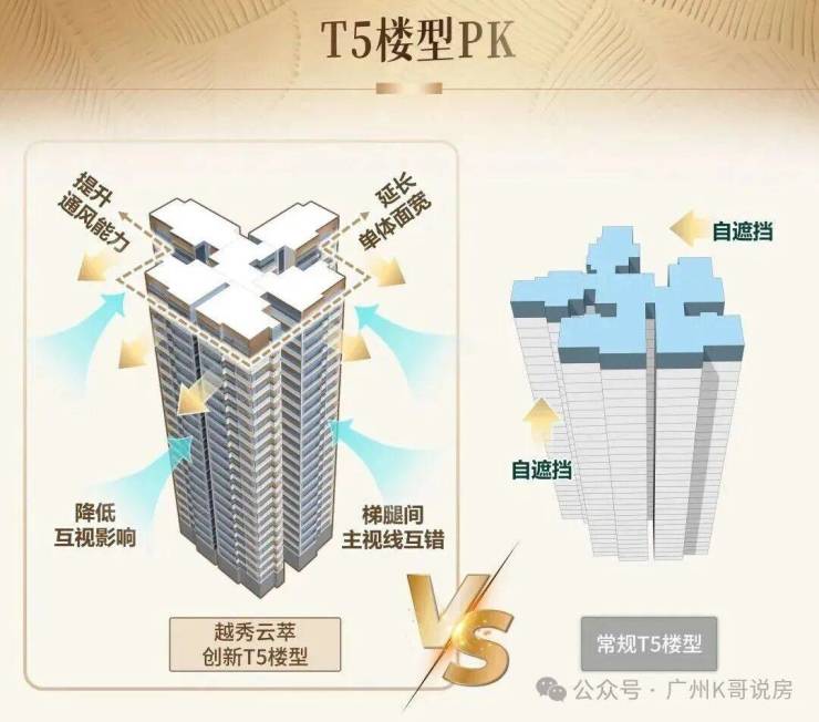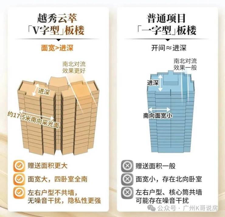 区别于市面常规一字型板楼(开间≤进深),云萃独创 V 字型板楼实现开间>进深,多重优势拉满体验: