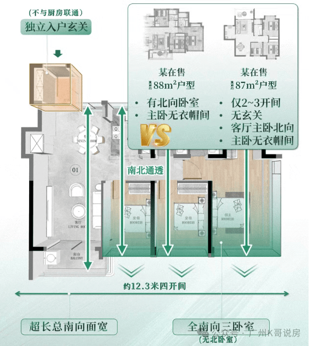 约12.3米总南向面宽,客厅和卧室均为南向布局