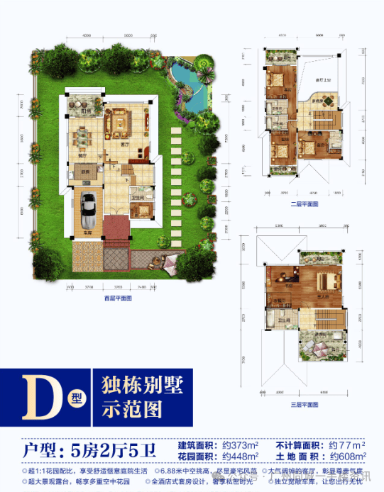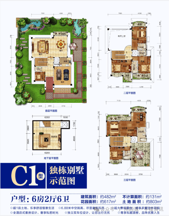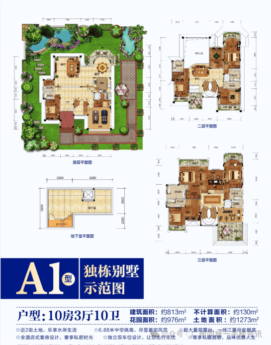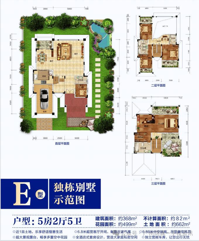 天晟海琴湾整体采用欧陆式建筑风格,花园赠送面积1:1,6.88m高的超豪客厅、全酒店套装设计、私家车库、超大露台及空中花园,满足五代同堂的家族式生活所需,让每一种生活均有独立的空间,是家族传承的首选别墅。