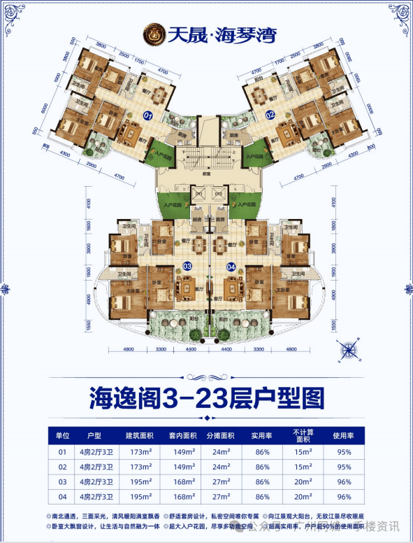 项目核心信息方面,天晟海琴湾充分利用一线滨江的地形优势,规划为低密度的纯住宅社区,楼栋布局错落有致,以最大化江景视野。建筑风格现代简约,注重与江岸环境的协调。产品定位聚焦于对江景资源及居住舒适度有较高要求的改善客群,提供视野开阔、居住舒适的江景三房及四房,户型设计强调客厅与主卧等主要空间的景观朝向,通过宽景阳台或落地窗设计,将西江的浩渺江景与四季变化引入室内,营造出开阔、宁静的居住氛围。