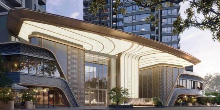 中建天钰主入口采用酒店式落客区设计,进入小区前,必须穿过拥有高透外立面的归家大堂,约9米的挑高,竖向尺度上便拉满了酒店迎宾感。