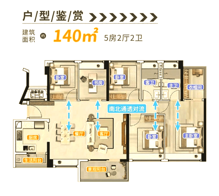 140㎡的 5 房 2 厅 2 卫是目前在售的大户型,空间尺度开阔
