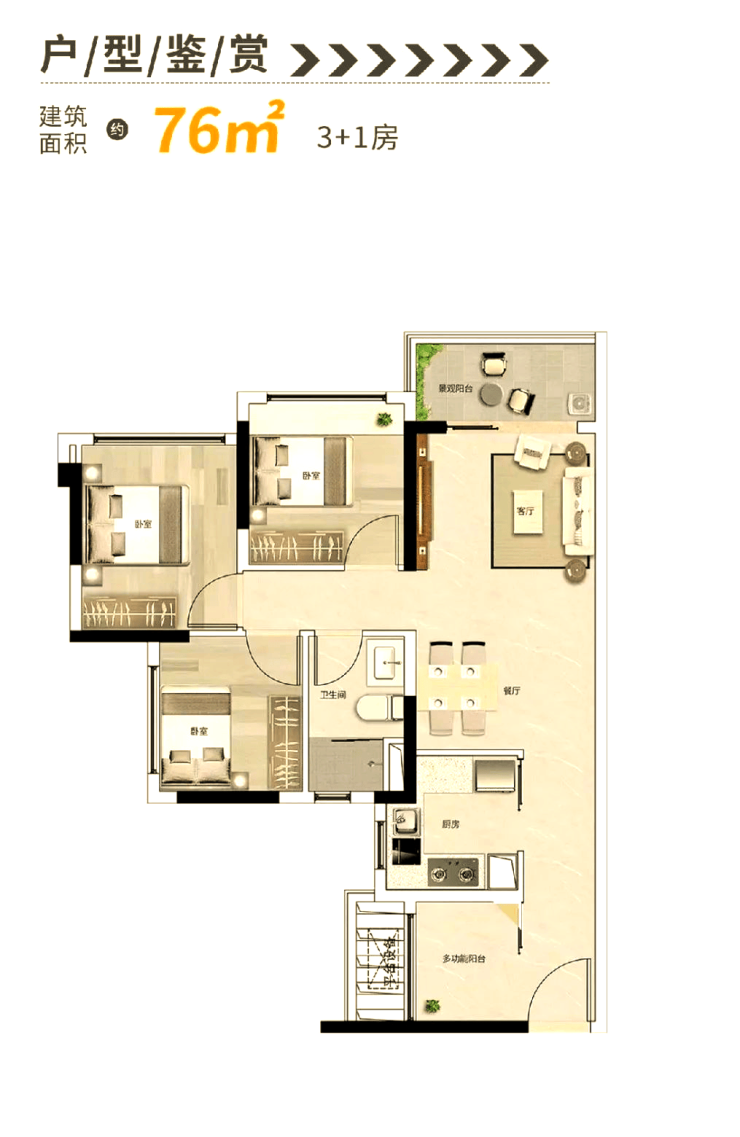 76㎡的 3+1 房是典型的刚需户型,超 87% 的实用率让空间利用率很高