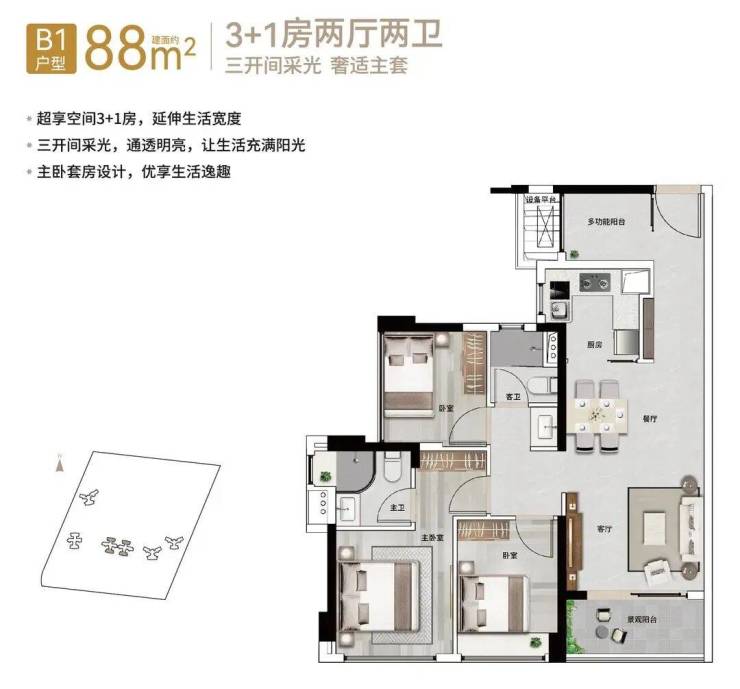 88㎡的 3+1 房则在空间舒适度上更胜一筹,同样延续了高实用率设计