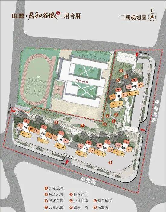 中鼎珺合府在售的二期,总共8栋楼,层高33层,均为三梯五户设计,精装现楼交付,小区整体为L型布局,前后无遮挡,采光比较好,就是花园不大。