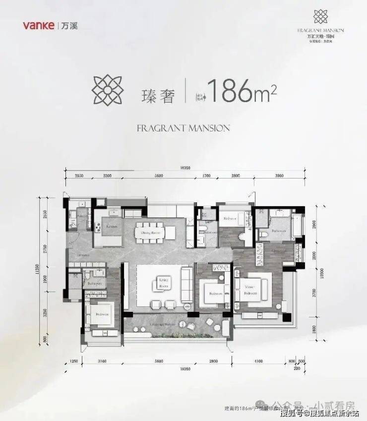 建面约 186m² 4 房 + 2 厅 3 卫 + 灵动空间,正南向 01、02 户型一线花地湾河涌景观视野,全明四开间朝南,约 18.3 米极致奢幕视野,LDKB 洄游路线,多功能巨幕宽厅,多功能岛台,端厅套房主卧
