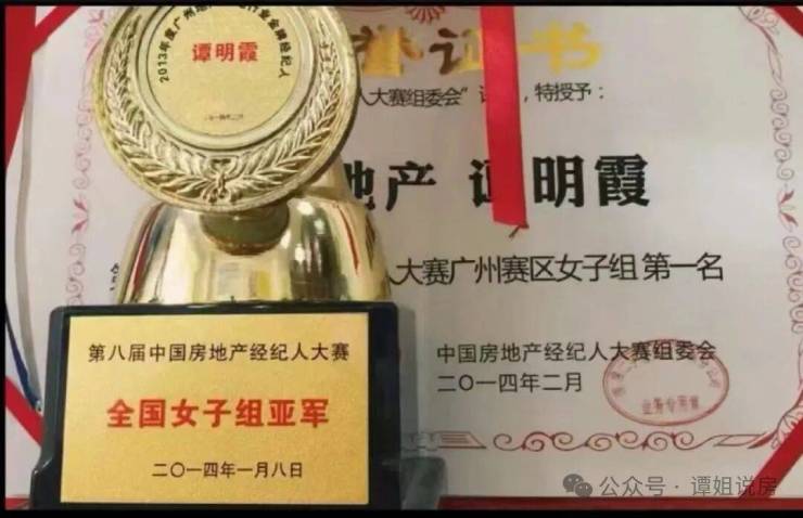 2024年获得广州房地产经纪人大赛女子组第一名,这纯粹是买家给的好评率评上的(当时广州30万房产从业者,每个人的买家给自己经纪人评分)