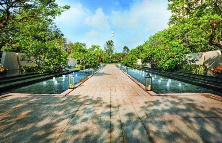-对称水景结合对景景墙强化空间的轴线感,更显端正