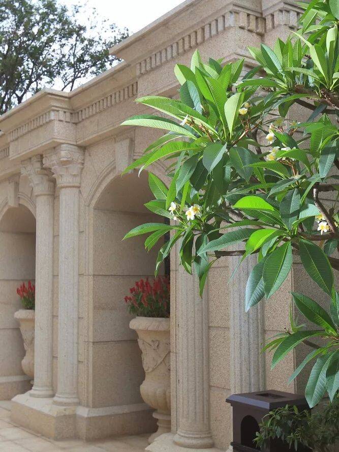 -岗亭的设计端正而古朴,米色调的黄金麻花岗岩显得整体更加敦厚