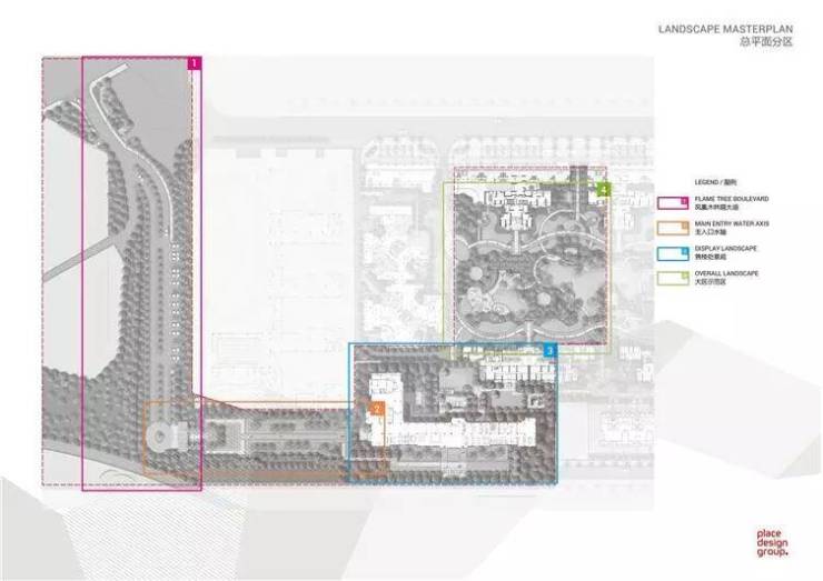 -为配合主入口与水景广场轴线、仪式感强烈的景观氛围,植栽设计多采用对称式布局,采用了凤凰木、鸡蛋花、兰花鼠尾草等具有华南特色的本土植栽