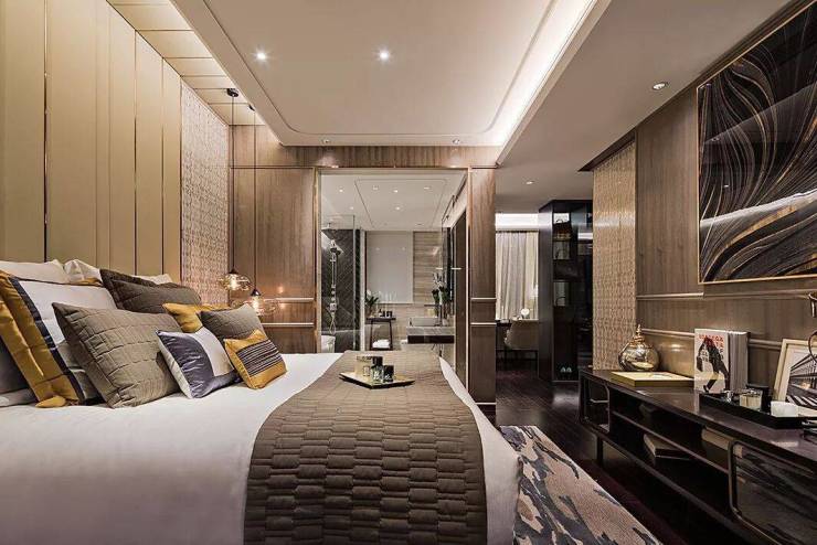 168平米的华发广钢样板房的目标人群面向成熟家庭,客厅的大阳台开间长度跟客厅及厨房相对,铝合金的推拉门给予最大活动幅度的一扇, 将开放式厨房、餐厅和书房,展示空间解构成一个联动的开敞社交空间,为该户型带来革命性的新气象。室内建筑采用极简派的色调,但以家具布料的大胆选用作为补充,并搭配其它元素,比如定制的步入式衣柜,手缝皮革抽屉,木饰面板和意式白色大理石装饰的卫生间墙面和台面,从而营造出奢华,精致的氛围。