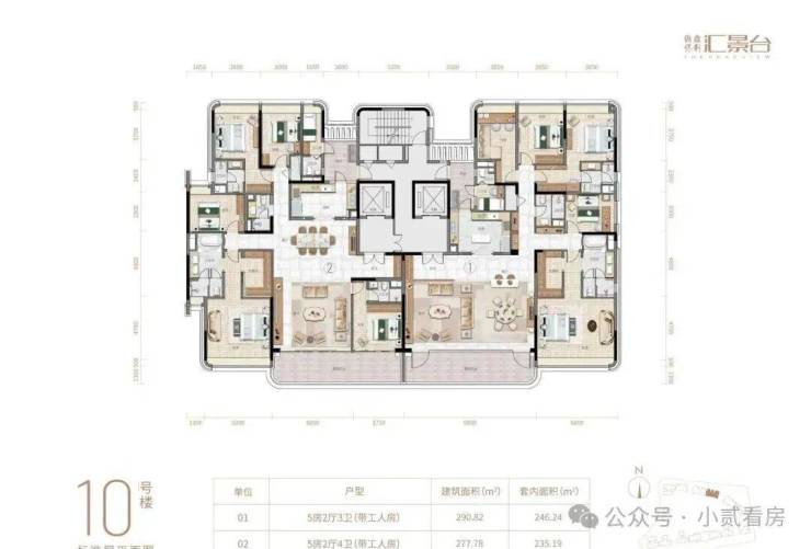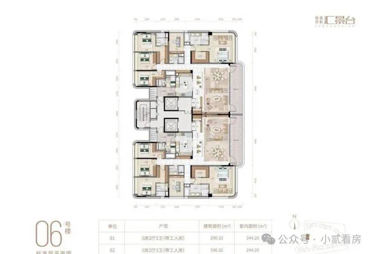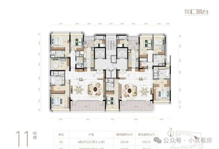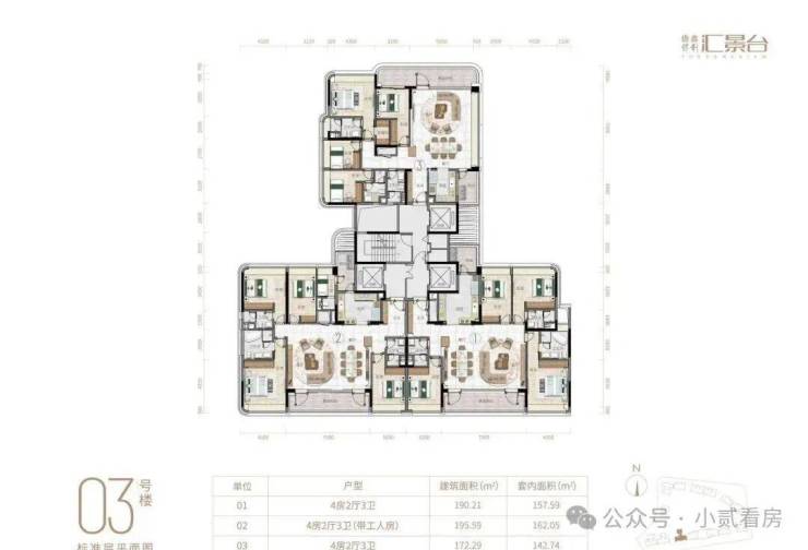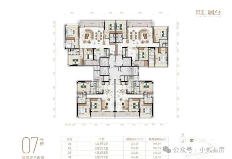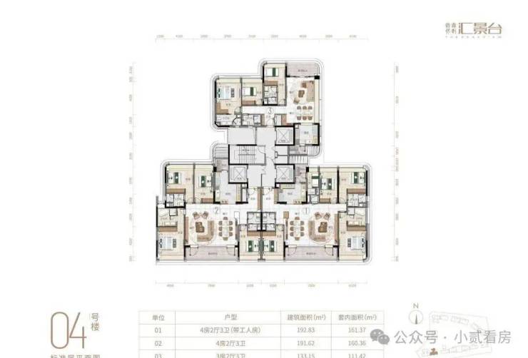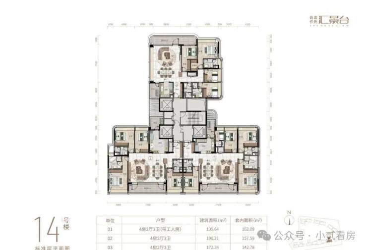 项目由14栋12层小高层组成,产品涵盖123-352㎡三至五房,共8类户型,户型实用率约82-84%