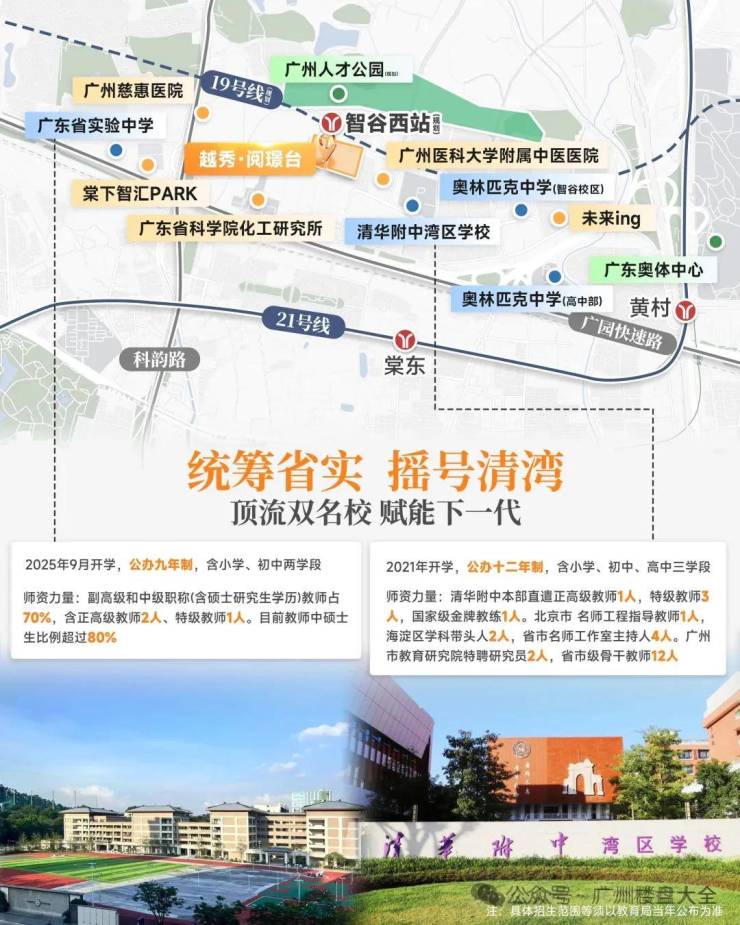 核心优势:项目由广东实验中学天河学校统筹安排学位,同时可参与清华附中湾区学校摇号,形成"省实统筹+清湾摇号"双名校保障体系,配建幼儿园实现12年教育闭环;距地铁21号线棠东站约1.5公里,规划19号线智谷西站设于项目北侧(预计2030-2035年通车),自驾15分钟可达金融城,20分钟至珠江新城;周边有ING未来印商业综合体(22万㎡,已引入盒马、星巴克等品牌),距广州医科大学附属中医医院(三甲)约500米,步行可达;北侧紧邻天河人才公园(54万㎡),生态资源丰富。