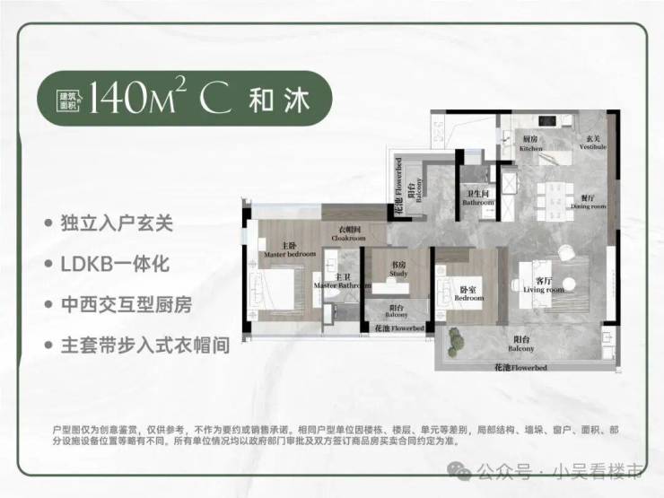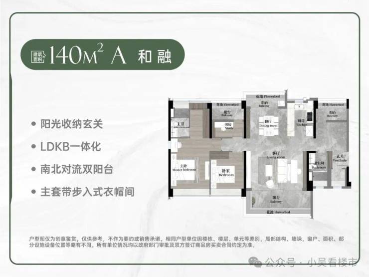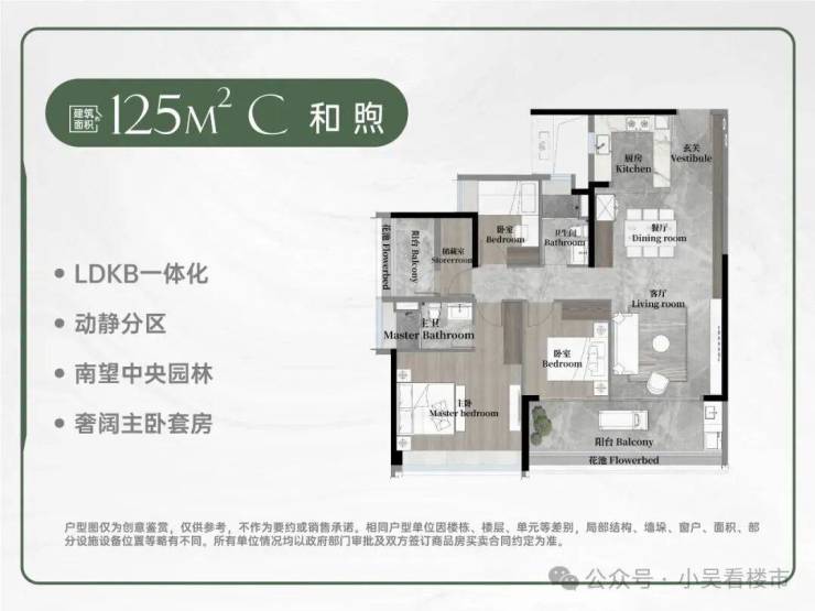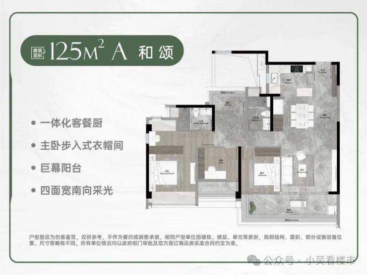 其中125平方米四房采用LDKG一体化设计,7米南向景观阳台可灵活改造,空间利用率极高;
