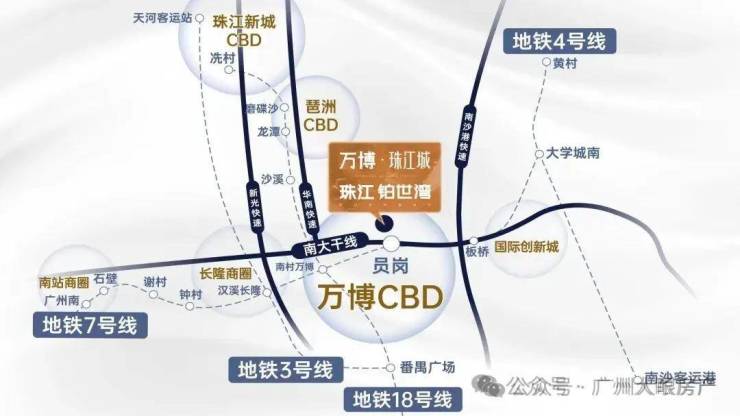 项目地处广州城市中轴&南大干线经济带双中轴交汇点——万博核心,南北CBD塔尖资源一脉尽享。