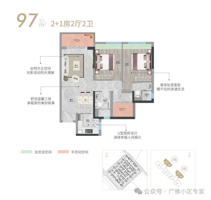 全明方正竖向双厅,U型厨房更多储藏空间,私享套卧浪漫生活