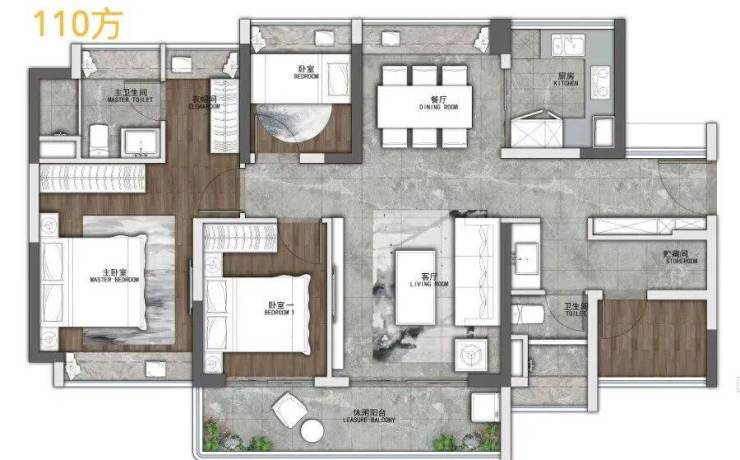 110㎡的3+1房,整体看起来很开阔,主卧更大气了,配备衣帽间。客厅阳台与次卧打通,所见景观更好。毕竟项目部分高层还可以望江,阳台够大也能放大景观优势。