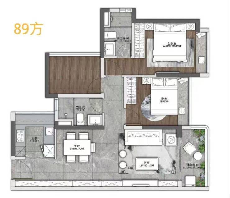 89㎡的三房,横厅设计,相比于78㎡的,主卧做了套房设计。且主卧与次卧的飘窗都很大,采光够好,住起来舒适度也会更高。