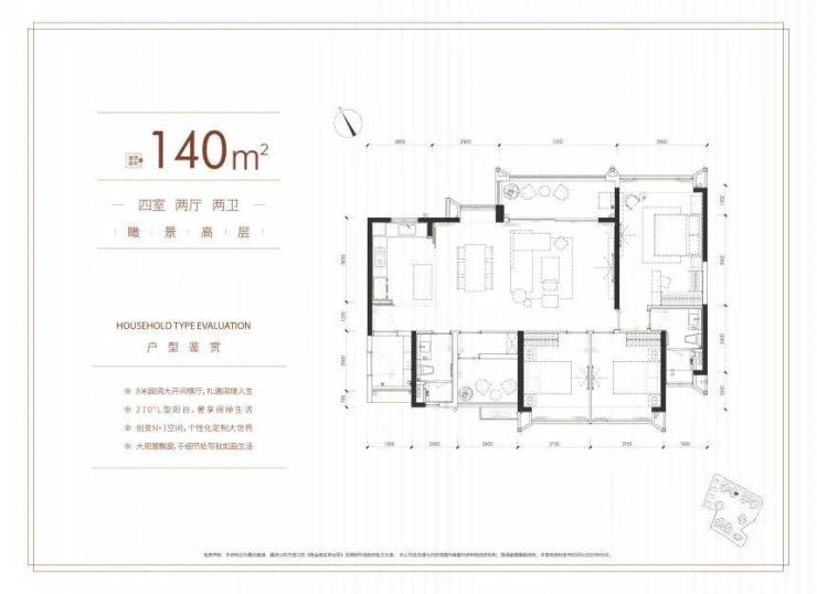 另外还有140㎡的四房户型,采用横厅设计,南北对流,北向主阳台望公园,南向卧室飘窗看小区园林,只是目前剩余房源已经不多,价格也相对更高一些。