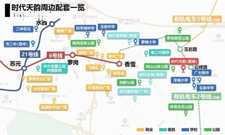 时代天韵所属的萝岗街道对口广州重点中学——苏元中学、科学城中学、铁英中学、省教育研究院黄埔实验学校(初中部)、北京师范大学广州实验学校(初中部)等